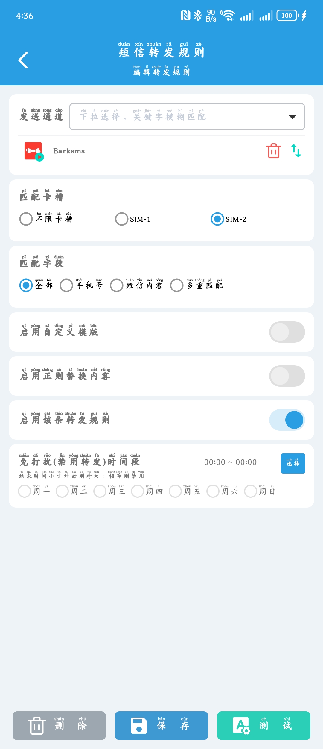 当设置根据手机号或短信内容时,请设置匹配的模式和值,例如:”手机号 是 10086 发送通道 选Bark“。