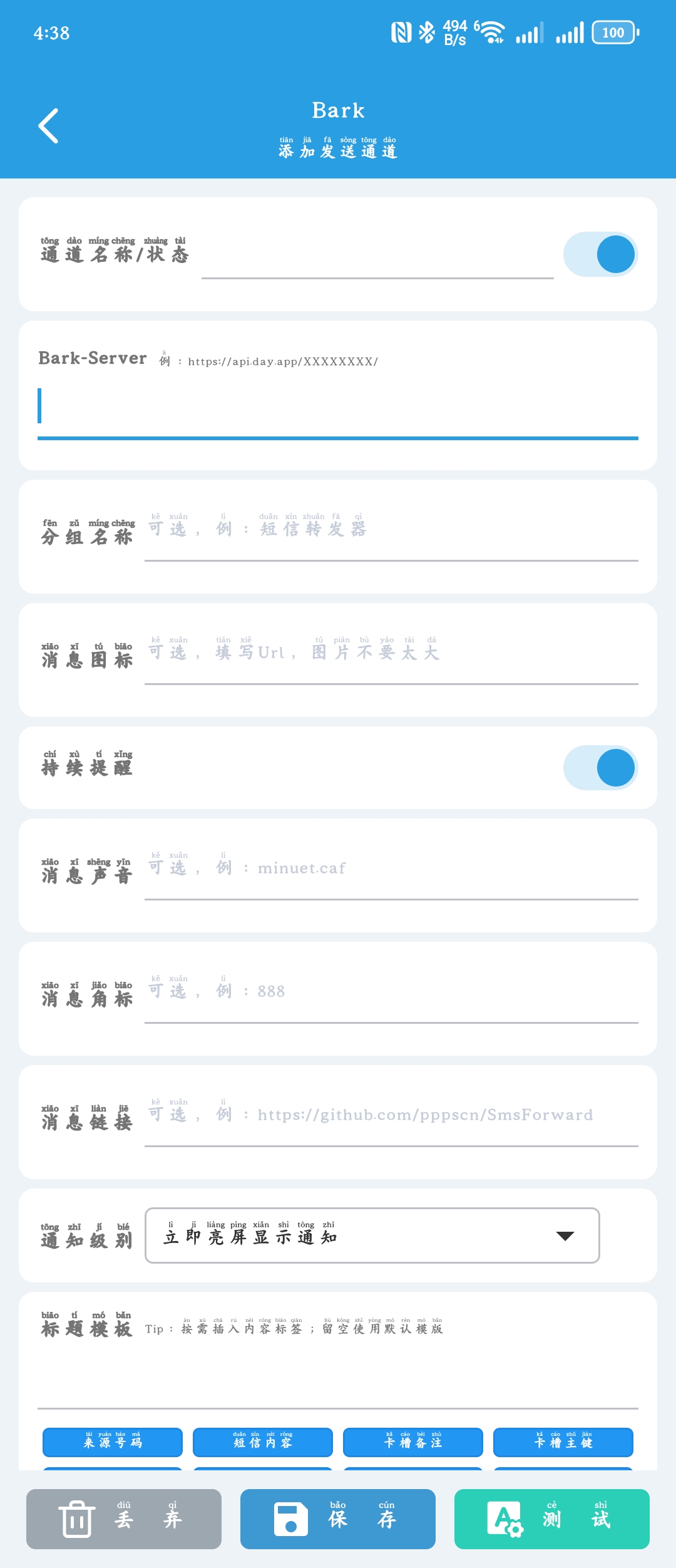 进入设置界面后,填写通道名称为Bark,在Bark-Server处填写 https://你的服务器地址/你的Key/ 其余的设置可以使用默认,就可以点击最下方的测试按钮,进行信息的测试发送,如果在客户端收到了消息,则标志设置正确,点击保存。