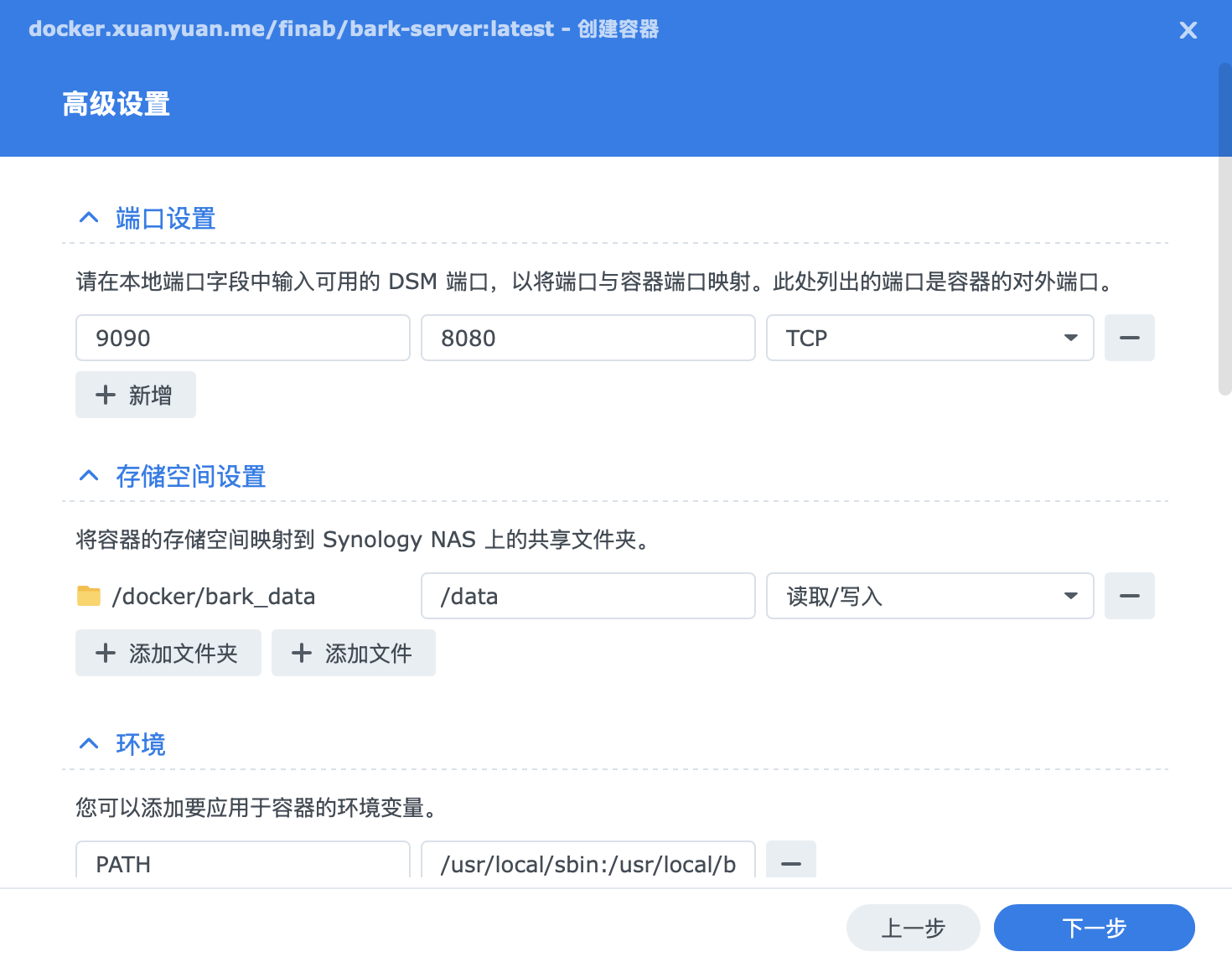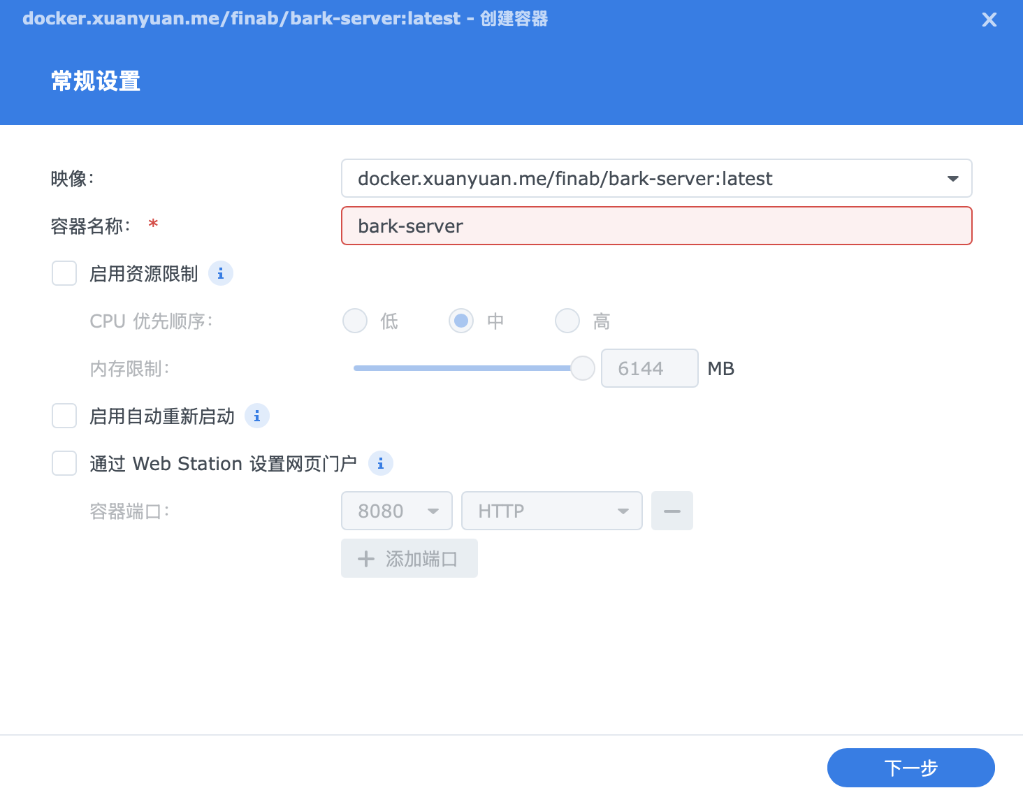 选中*/finab/bark-server映像,点击运行,开始进行设置。首先修改容器名称为 bark-server,然后点击下一步