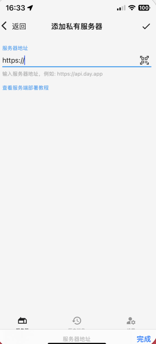 打开软件以后,默认会使用作者的服务器进行连接测试,考虑到我个人的信息隐私问题,我使用了个人的bark服务器。点击右上角的➕,然后输入服务器地址后,即可连接个人的服务器。