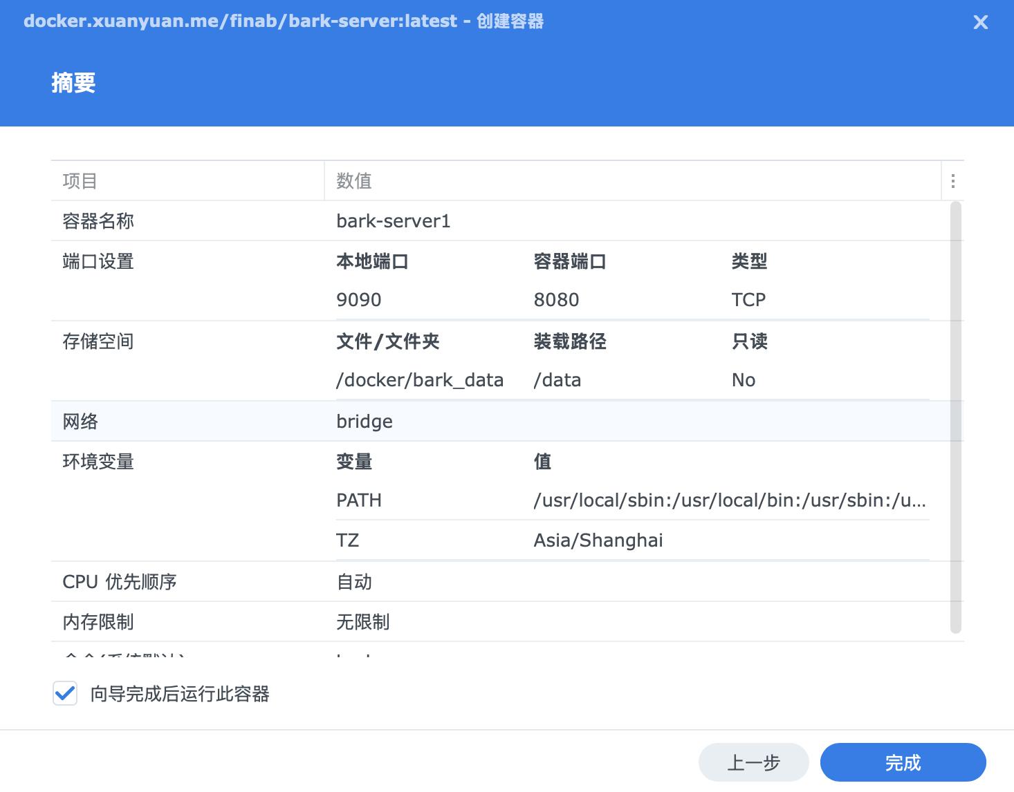 在此我们详细查看一下容器的设置参数,确认无误以后,点击完成开启容器。