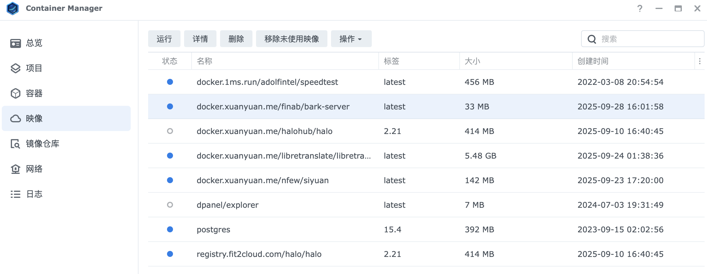由于我是使用了群晖NAS作为Docker的基础,在群晖 Container Manager的镜像仓库中搜索bark-server,找到finab作者的镜像后点击下载。下载完成后可以在左侧的映像选框中查看已下载好的映像