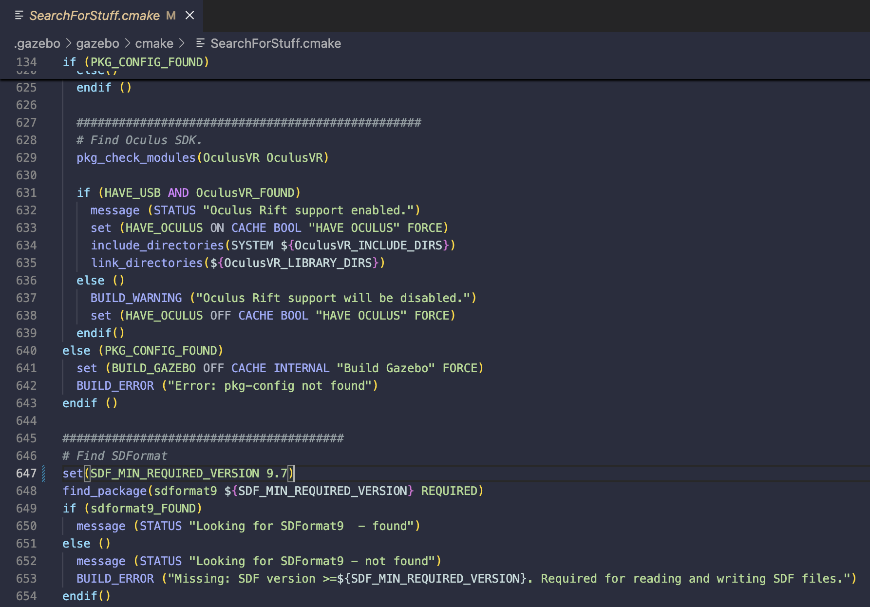 git clone https://github.com/osrf/gazebo进入gazebo下cmake 文件夹,找到SearchForStuff.cmake 文件,找到647行的set(SDF_MIN_REQUIRED_VERSION 9.8) ,将9.8修改为9.7然后保存。
