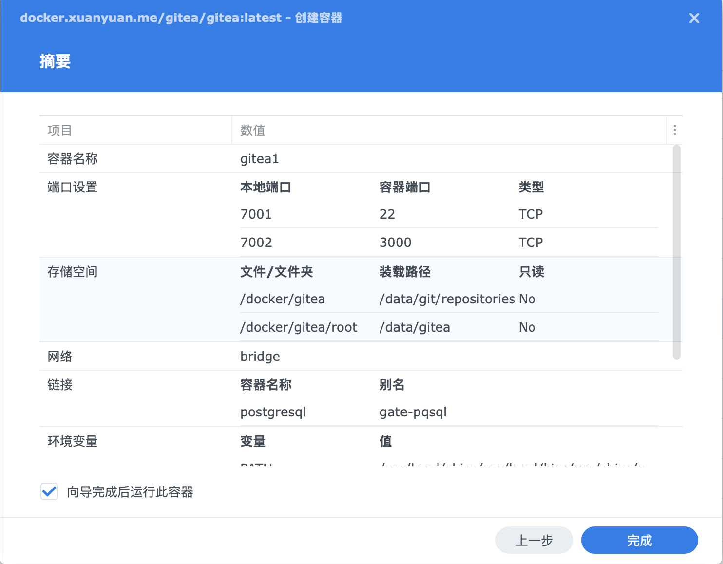 确认所有输入的参数和配置没有问题以后,就可以点击完成,让容器开始运行。