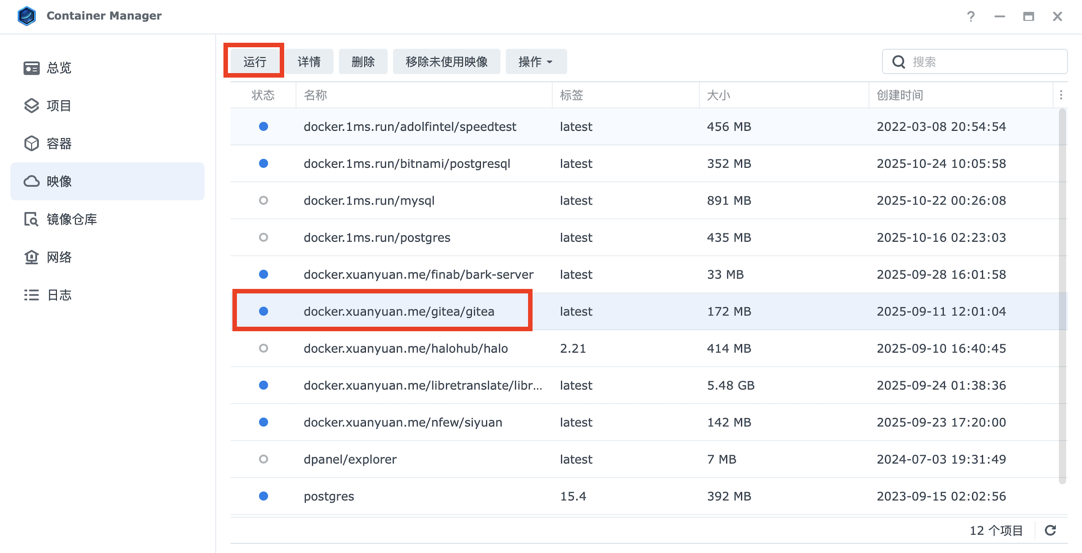 打开ContainerManager,在映像中找到刚才下载的gitea/gitea映像,选择后点击左上角的运行按钮。