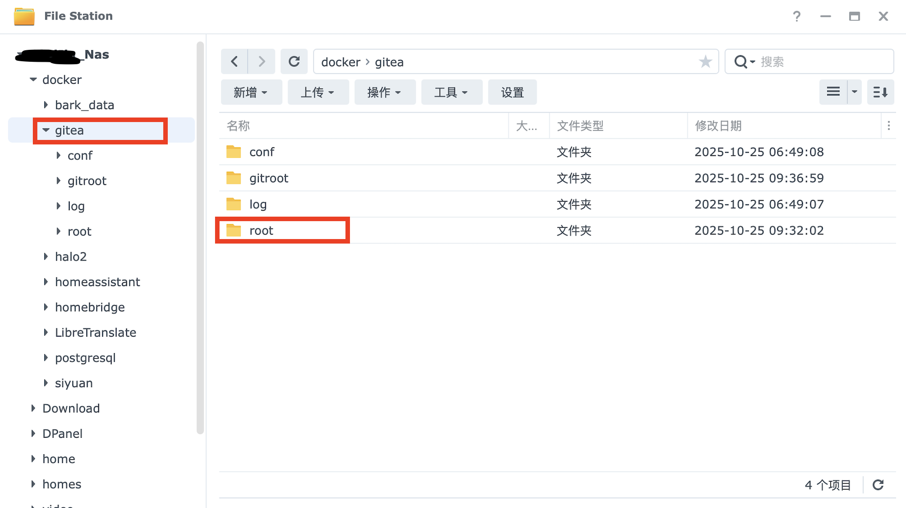 在FileStation中的docker共享文件夹下创建名字为gitea的文件夹,然后在其下创建root文件夹,为之后做好准备