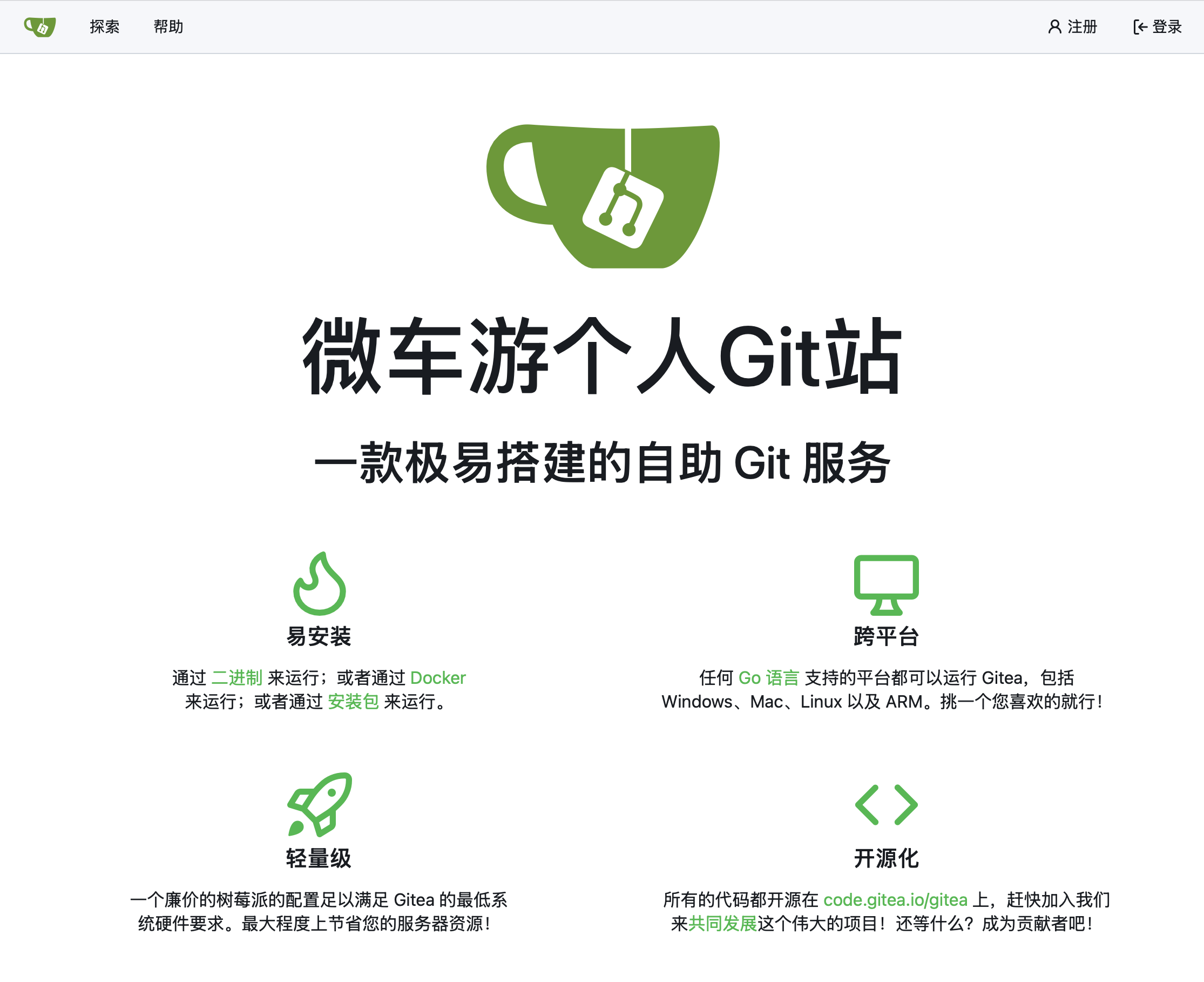 完成以上设置后,即可点击最下方的立即安装,等待一会就会自动跳转到新的页面。此时Gitea就已经安装完成。