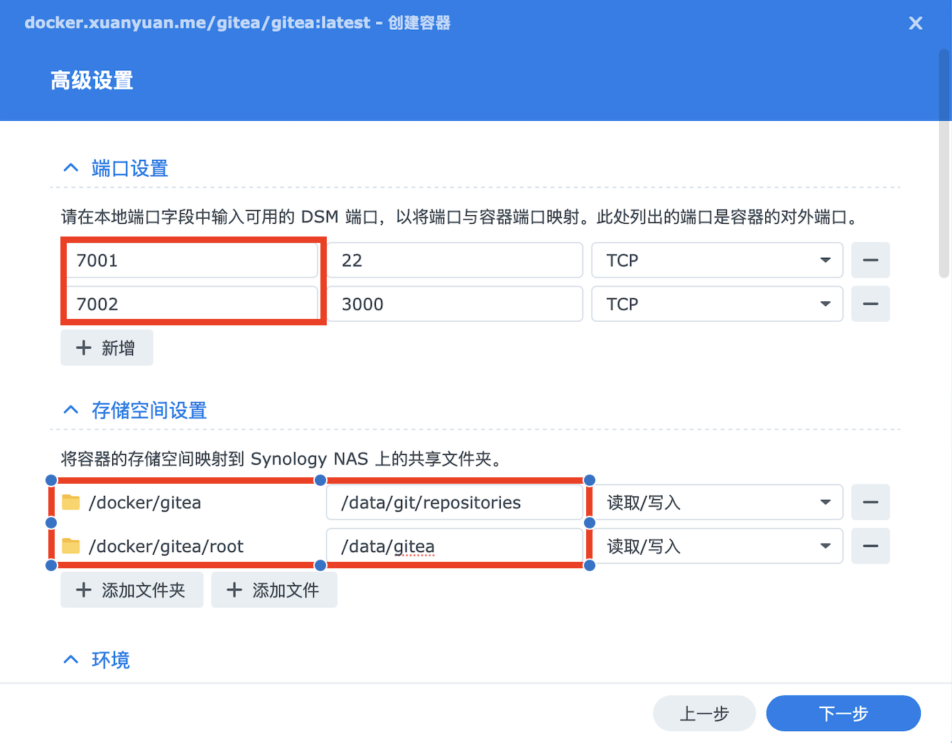 同时增加存储空间的映射,将容器的/data/gitea映射到宿主机的/docker/gitea/root ,将容器的/data/git/repositories映射到宿主机的/docker/gitea