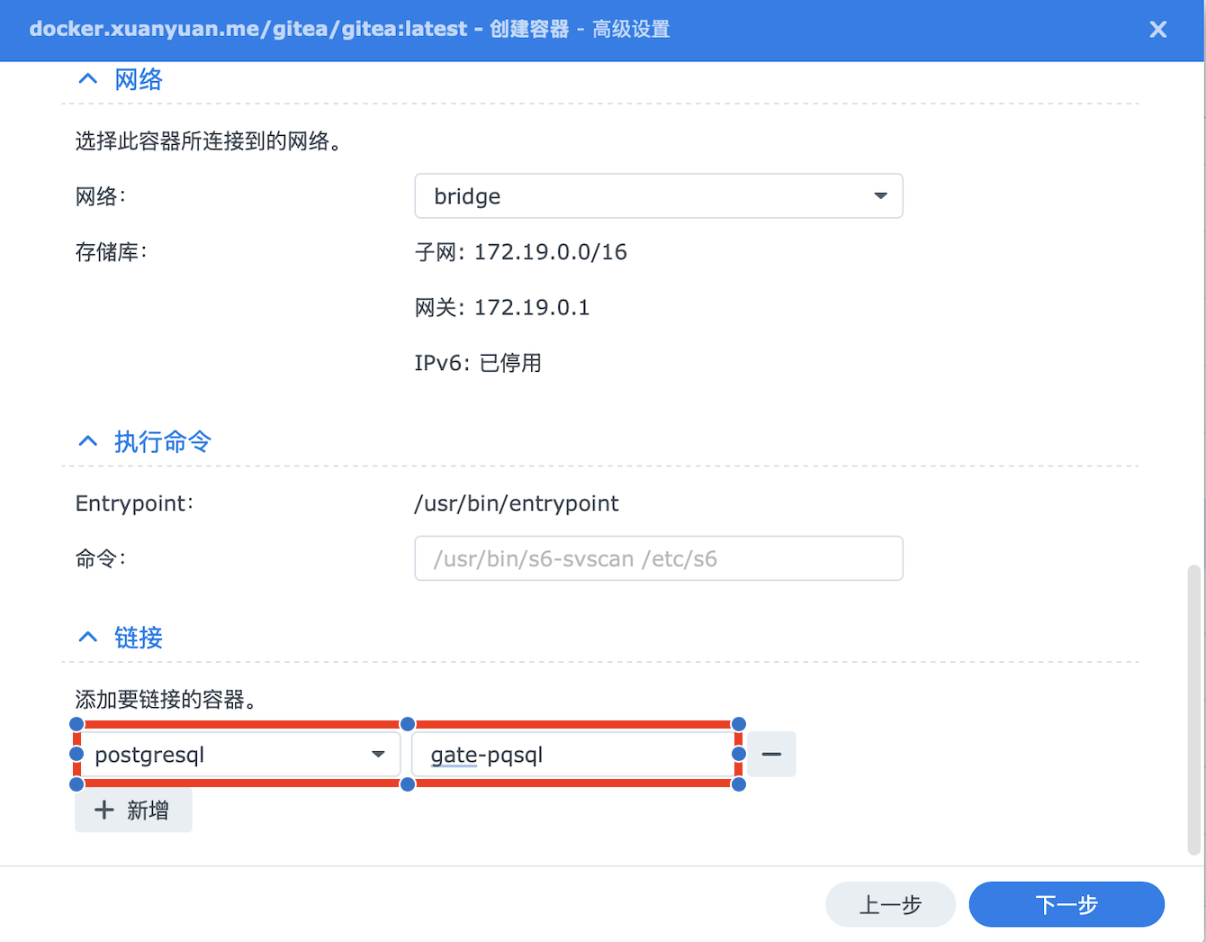 在最下面的链接中点击新增,增加链接容器posetgresql,取名为pgsql ,将以上设置好以后,点击下一步。