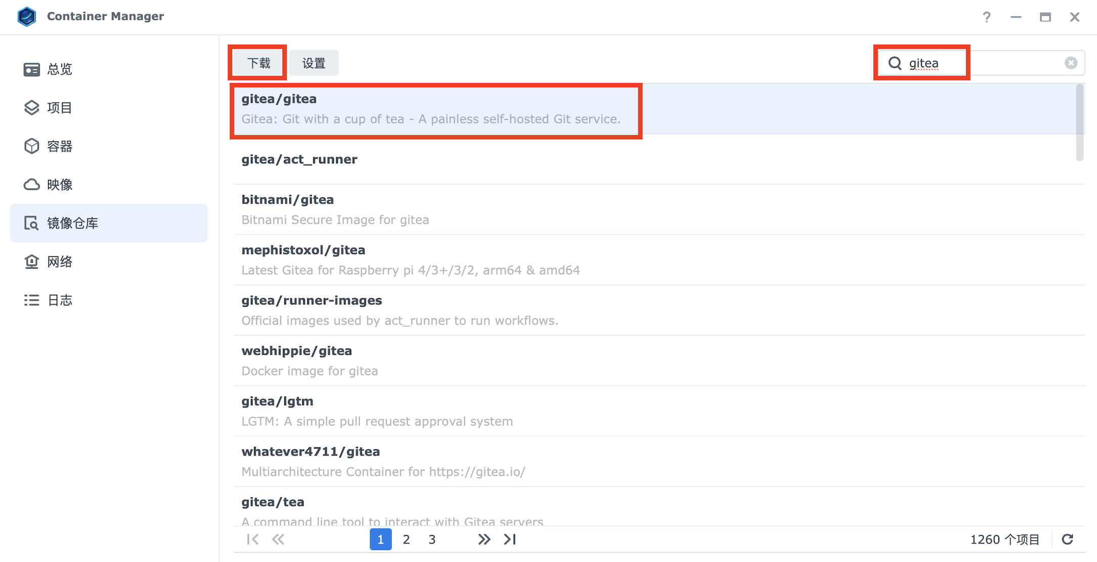 在群晖的Container Manger的镜像仓库中查找gitea,选择图中的镜像点击下载